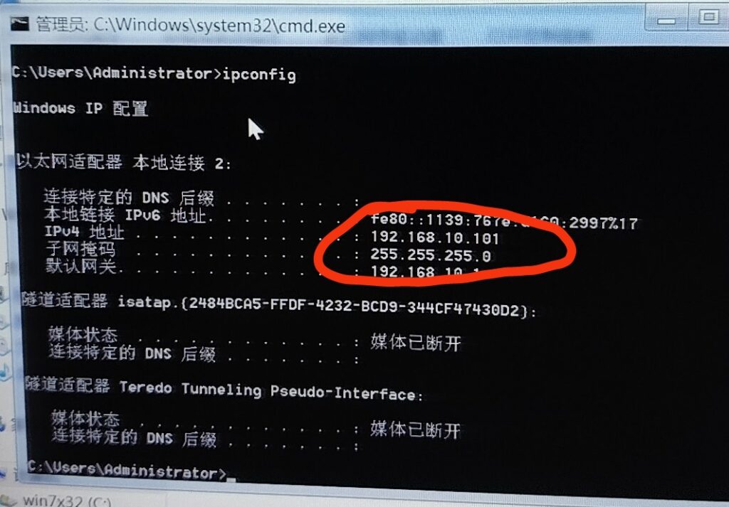 ④ win+r键盘,输入cmd回车,输入ipconfig命令回车,检查有线网卡是否拿到192.168.10.x的IP,如下图