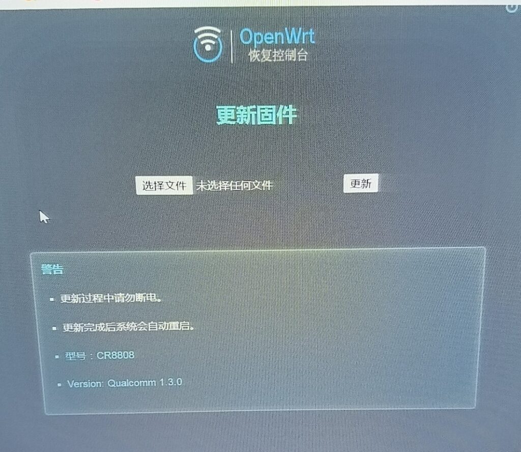⑥ 点击“选择文件”,选中下载好的固件文件(文件见文章底部下载链接),然后点击更新