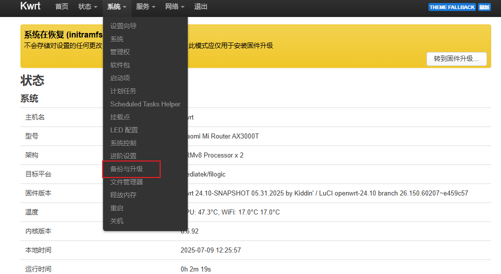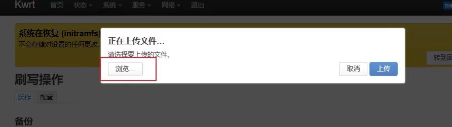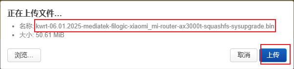 14、点击浏览选择文章开头文件包里的“kwrt-06.01.2025-mediatek-filogic-xiaomi_mi-router-ax3000t-squashfs-sysupgrade.bin”文件,注意bin文件格式,不要选择错误!!!随后点击上传