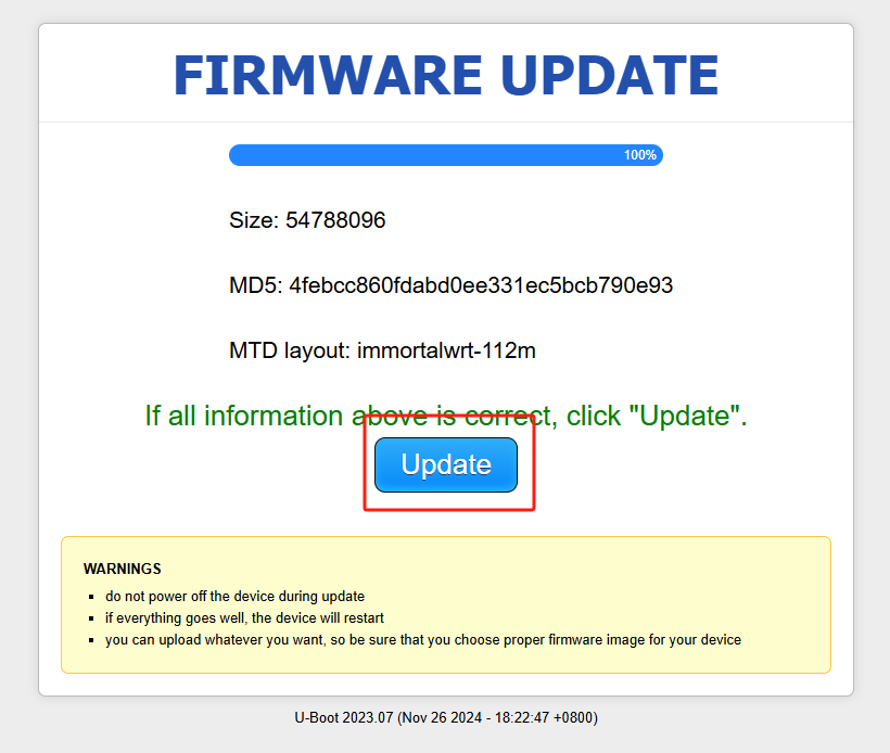9、点击update按钮进行刷写固件,后面不用观察页面,页面不准,有可能一直转圈