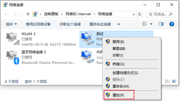 5、网络连接窗口下,找到与路由器连接的那个网卡,右键属性