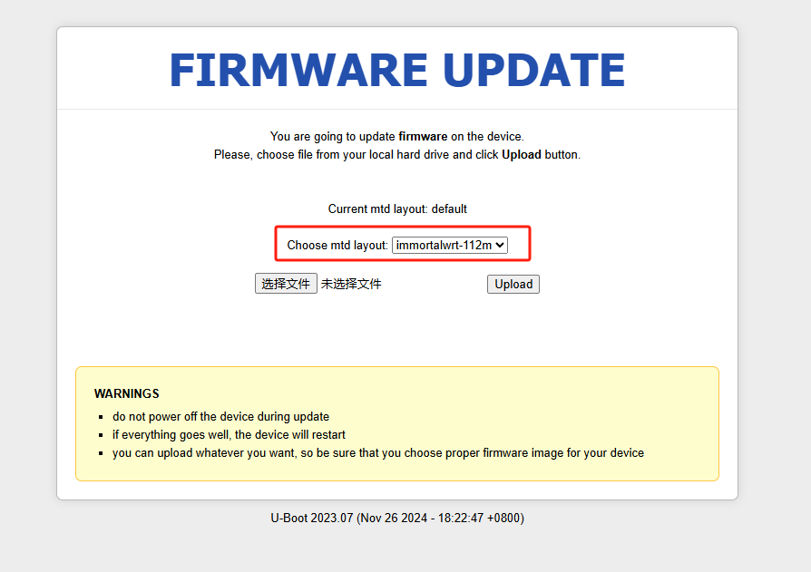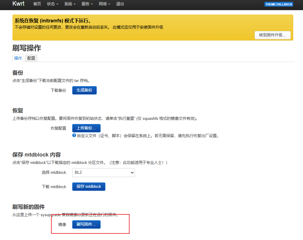 8、使用浏览器打开192.168.1.1,打开路由器的“不死后台”,如下图,下拉菜单选择112m,然后点击选择文件,选择文章开头文件包里的“kwrt-06.01.2025-mediatek-filogic-xiaomi_mi-router-ax3000t-initramfs-factory.ubi”文件,仔细看清楚不要选择错,关键字factory字样和ubi文件格式,不要选择错误!!!然后点击upload上传文件