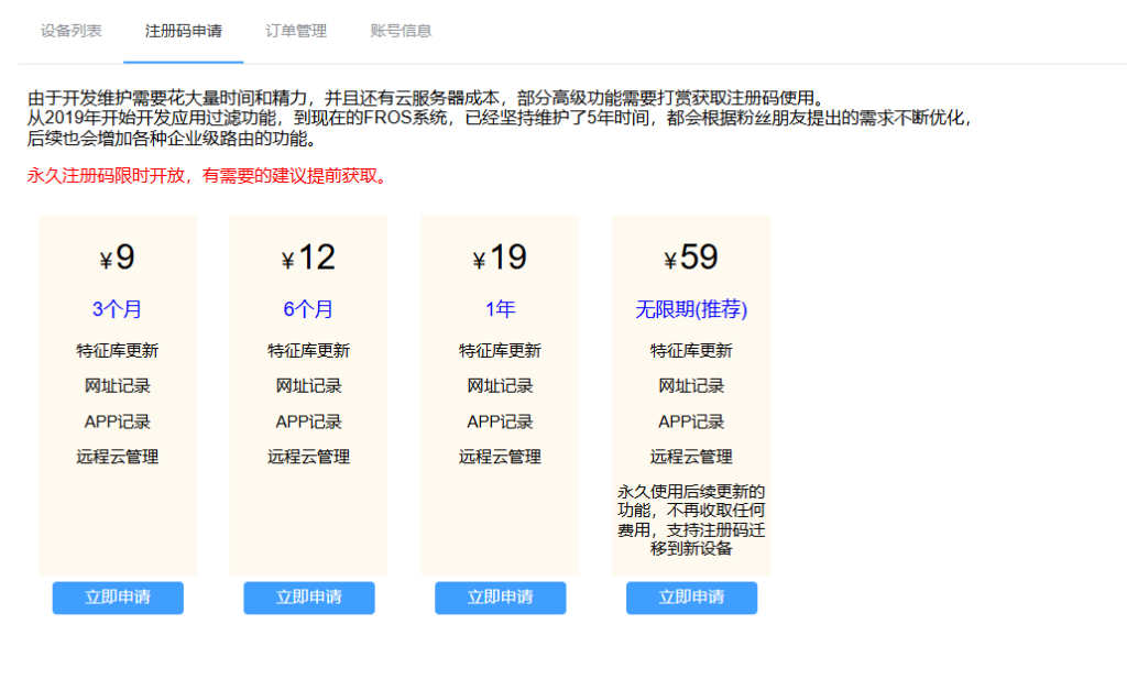 ④ “专业版”,路由器到手有七天专业版的试用时间,时间到期后还原为“普通版”的功能,需要在路由器后台注册账号然后开通“专业版”后才可以继续使用“专业版”的功能,价格如下